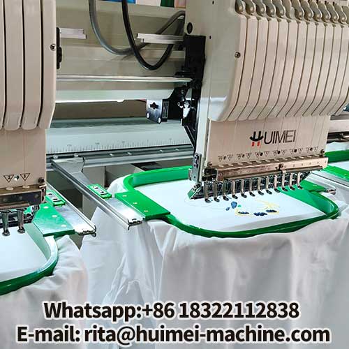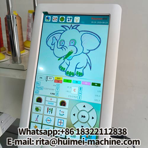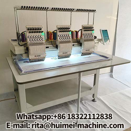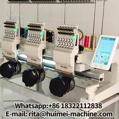 Mesin bordir komputer 3 kepala Huimei dilengkapi dengan sistem kontrol Raynen (standar) atau Daiho (opsional), yang menampilkan kait putar Hirose Jepang, spindel servo, dan kecepatan hingga 1000 RPM.